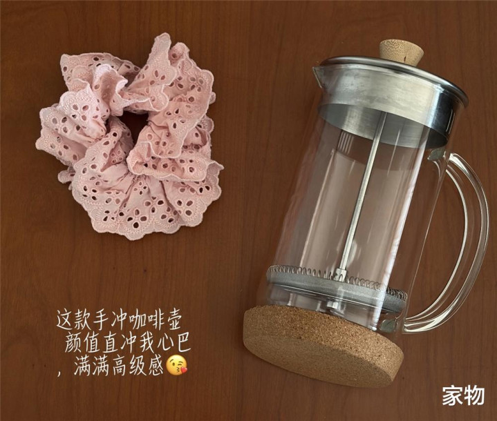 底部是那种木屑样式的防烫垫子,顶部有一个木把手,其余则为金属和玻璃材质,泡咖啡很方便,放在桌子上也很好看,但建议别泡茶,茶叶碎卡在里面很难清洁。