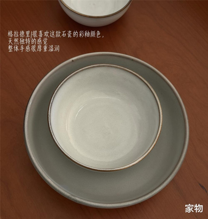 最后再说一组碗碟吧,据介绍它是炻瓷材质,具体如何我倒是不清楚,只知道它拿在手里沉甸甸地很有分量,釉面也是饱满十足,有种温润的手感,好看还方便清洁打理,简直是神级餐具了~
