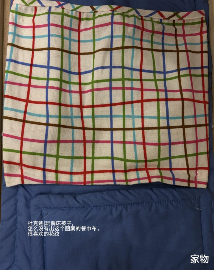 而这玩偶床被子,其实更像是个小垫子,彩色线条真的好看,以后要出大版四件套或者餐巾桌布什么的,我必买。