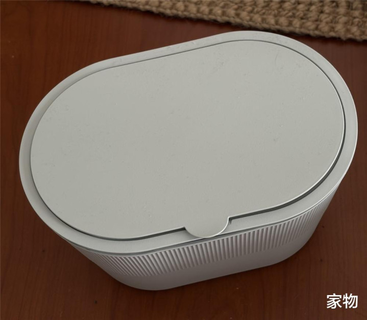 这带盖垃圾桶我也要夸一夸,它是个椭圆柱体造型,上面有条纹装饰,而且看起拉力很轻薄,真的是非常好看,自然,你可以把它放到厨房、卫生间里当垃圾桶,也可以学学我家“不务正业”的用法。
