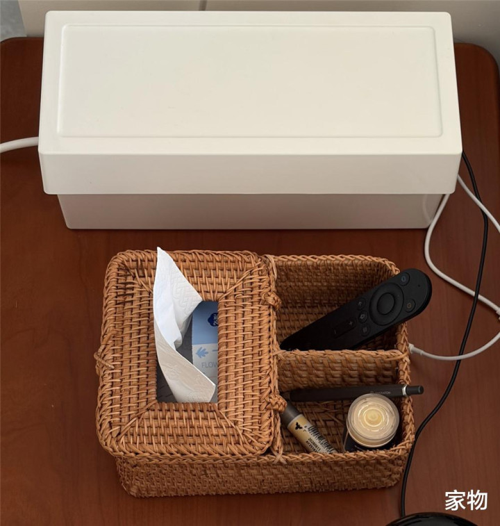 我推荐你试试宜家这种线材整理盒,可以将插排、充电线、插头等各种线材藏在里面,盖子一盖,就是个可以置物的白色盒子,让桌面看起来整洁许多。